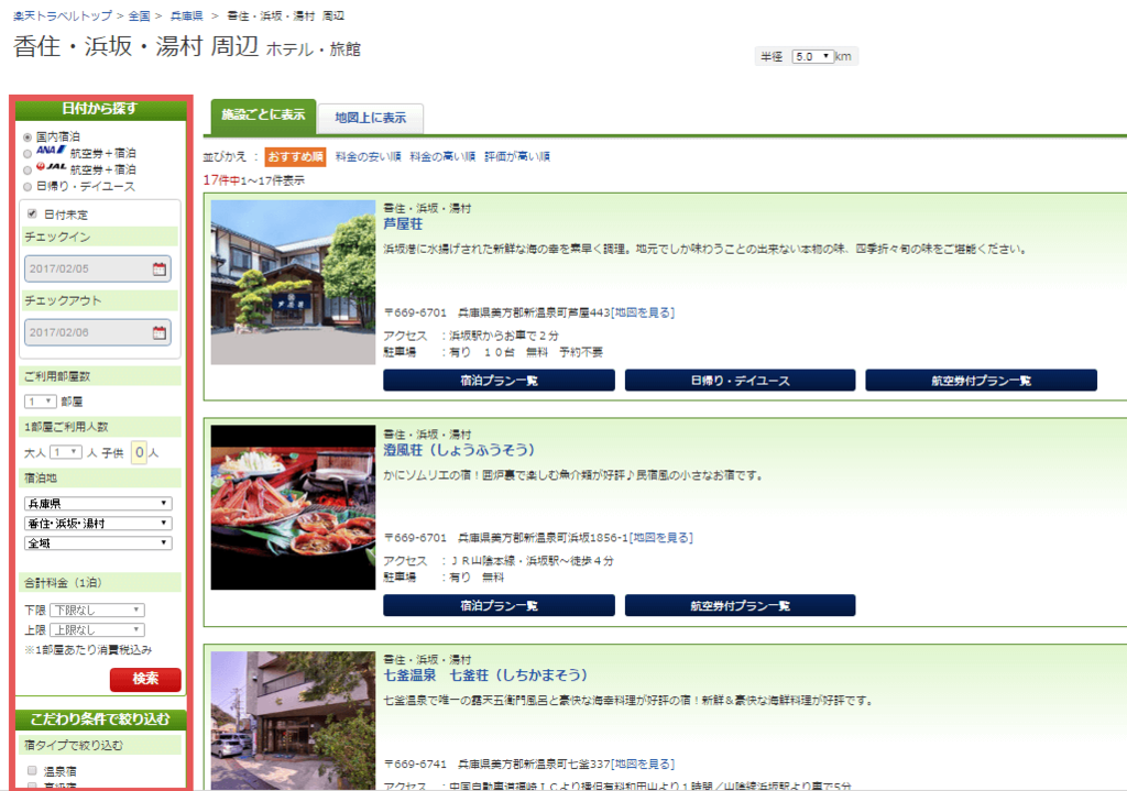 UIで大きく違うのはエリアでの検索ツールバーの位置。楽天トラベルの検索ツールバーは左サイドバーにあり、