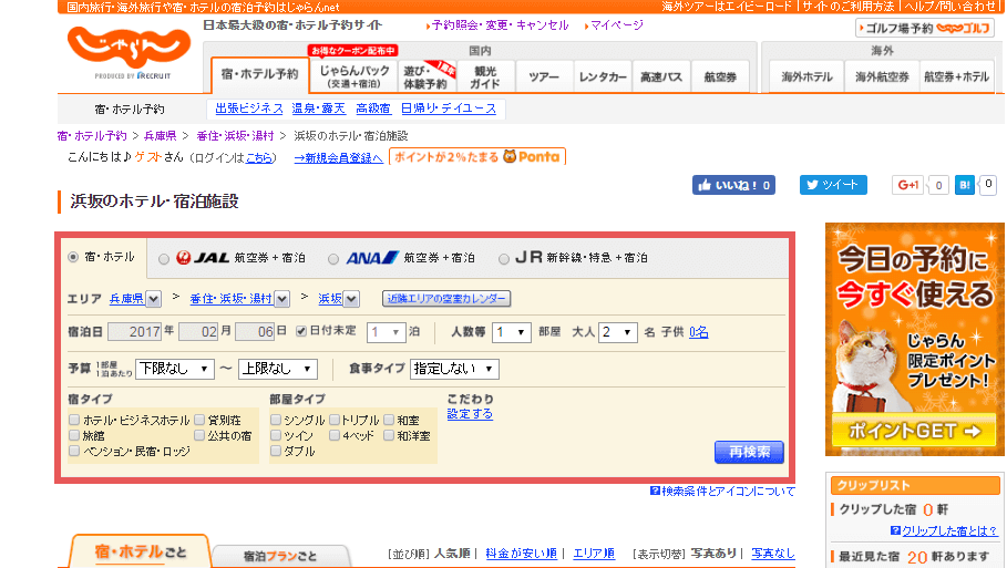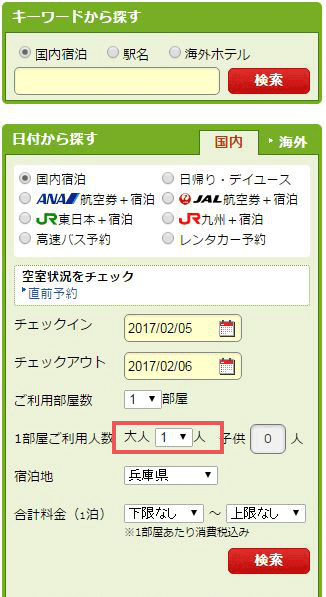 楽天トラベルでは検索フォームのデフォルトは大人1名ですが、じゃらんでは大人2名がデフォルトです。