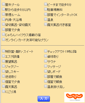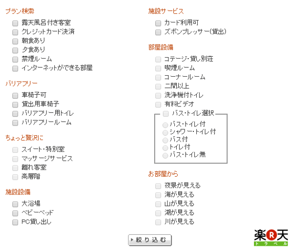 楽天トラベルはPC貸出やズボンプレッサー、有料ビデオ、客室のバス/トイレ、など部屋設備を細かく指定できビジネスマン向け、じゃらんでは貸スキーや貸ボード、卓球、エステ施設などレジャー指向なのが伺えます。