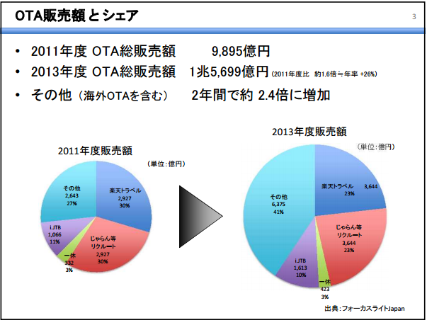 出典:電通による資料-日本のオンライン旅行市場楽天トラベルもじゃらんも取扱額は年々伸びていますが、ここ数年一時期の独占状態から比べると他のOTA(一休.comやるるぶトラベル、JTB)外資系OTA(Booking.comやExpedia)のシェアが拡大しています。オンライン予約の総取扱額の上昇と伴に、新興の予約サイトの成長や外資系の海外の予約サイトの日本進出が目立ちます。