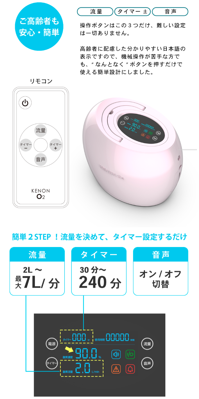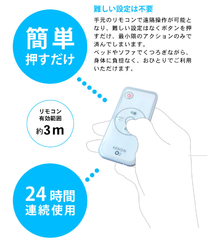 例えば、酸素吸入が必要とされる高齢者にとっては、操作のたびに立ち上がって移動することも負担になり、ご家族に毎回操作をお願いするのも大変です。
