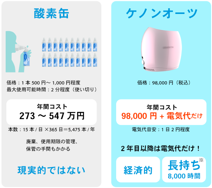 毎日30分間吸引した場合、使い切りタイプの酸素缶とケノンオーツを比較すると、こんなにも差が出ます。