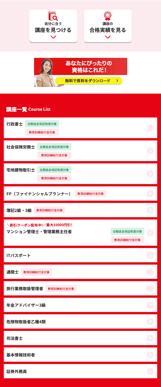 不合格なら受講料を全額返金する制度や、2つ目の資格取得がお得になる制度など保証も充実しています。