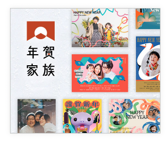 年賀家族2026では、他には無い加工がたくさん用意されています!高級感のただよう「ホログラム加工」や、写真を独自のエフェクトと自動合成技術によりデザインの世界に溶け込ませる「ナジーム加工」など、目を引くようなデザインがたくさん!
