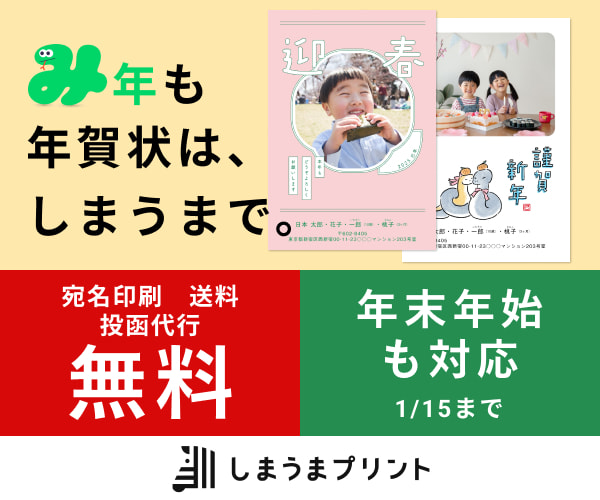 | 挨拶状ドットコム | 40% | 7,335円 | 7,929円 | 無料 | 翌営業日 | 1枚11円 |