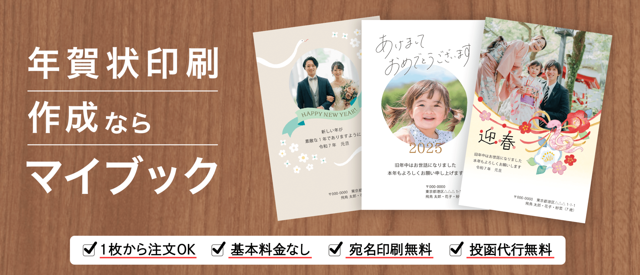 スマホやデジカメの写真をフォトブックにできるサービスを展開しているマイブックでは、年賀状の印刷サービスも行っています。