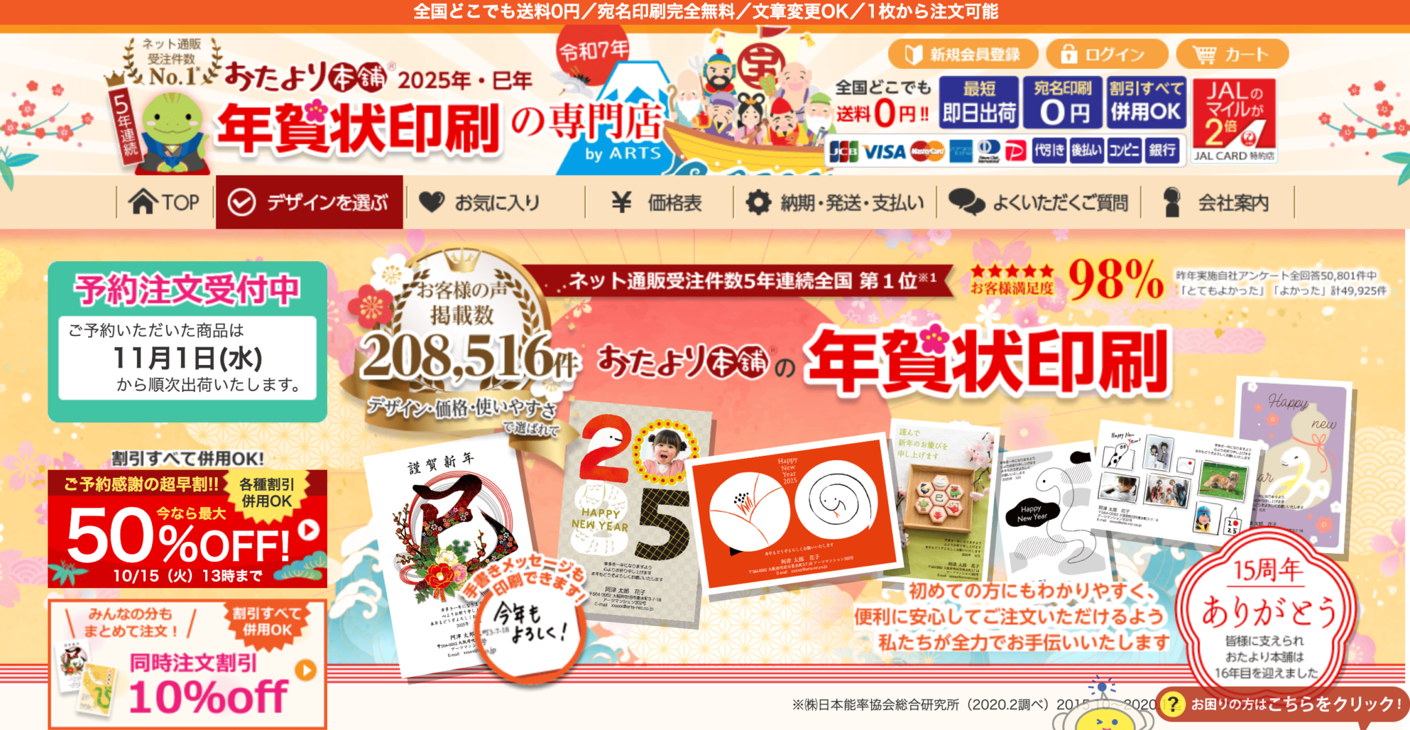 そして、早割の割引率も高く、ネット通販受注件数5年連続第一位(㈱日本能率協会総合研究所調べ)で、最も人気の年賀状通販サイトとなっています。