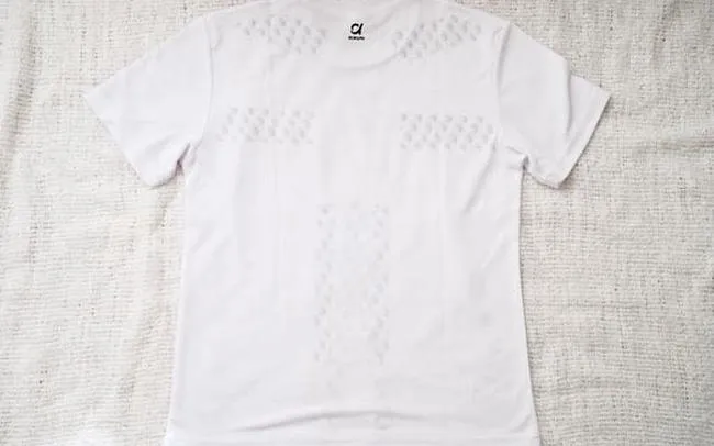 リライブシャツαの生地の裏側には、遠赤外線を発する鉱石を含んだ特殊なテープが施されているのが特徴。テープは、体のポイントや主要な筋肉に当たる位置に施されている。